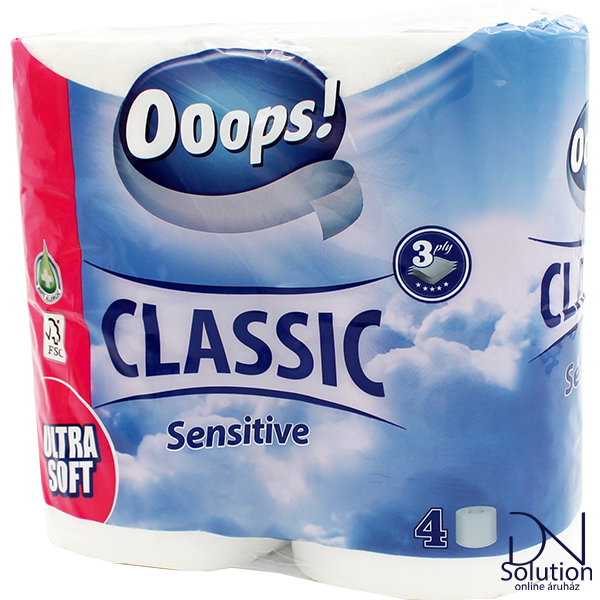Ooops Sensitive toalettpapír, 4 réteg, 3 tekercs, 140 lapos – extra puha és kíméletes az érzékeny bőrhöz. Kiváló nedvszívó képesség, erős és mégis gyengéd, a mindennapi higiénia tökéletes választása.